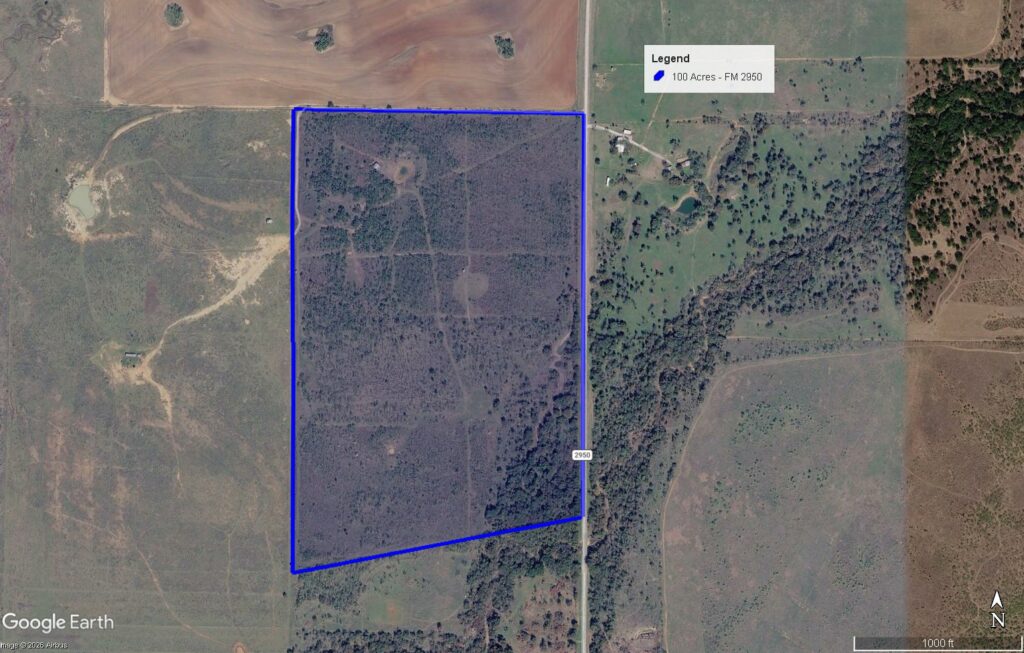 100 acre tract just northwest of Jermyn, TX set up perfectly for a hunter’s paradise or a great ranch to build your dream home. Mostly large, old-growth mesquite trees providing great cover for wildlife. The southeast portion has dense hardwood cover with Cameron Creek running just south of the property line. There are a few small stock tanks and an old windmill. The area around Jermyn is known for having good ground water.  The property includes a small hunter’s cabin and has many trails all throughout allowing for easy access to the whole property. Electricity runs through the northern portion of the property. Access off of FM 2950 with approximately 0.45 miles of frontage.