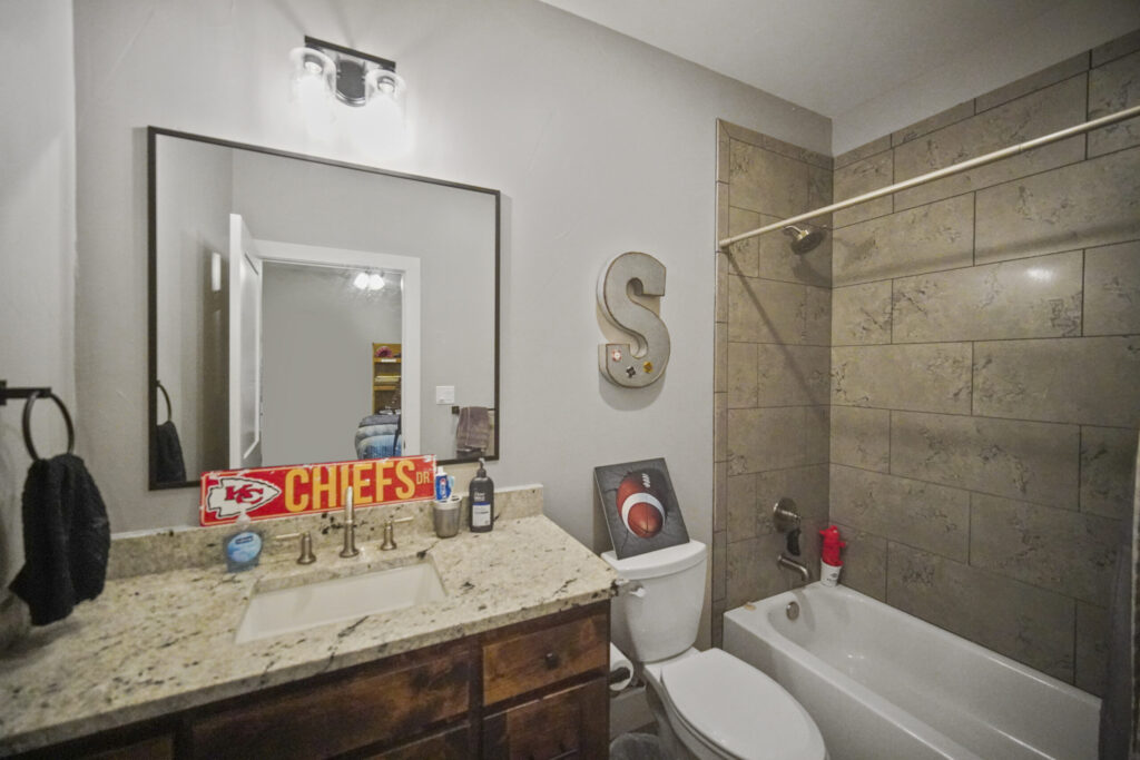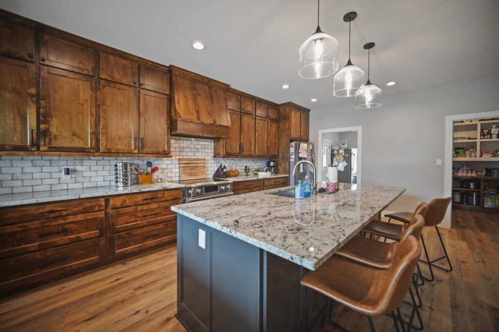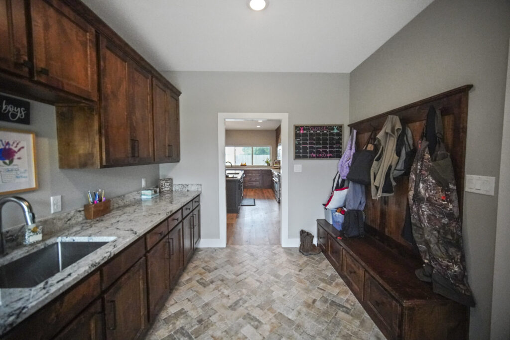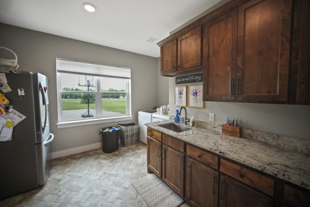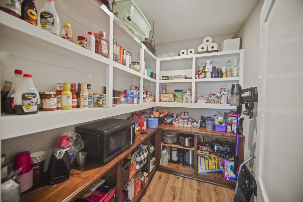 The kitchen is designed for both everyday living and entertaining, featuring a 5-burner Thermador cooktop, self-cleaning oven, and a spacious island with counter-height seating. A massive walk-in pantry ensures you’ll never run short on storage. Just off of the main living areas, the utility/mud room blends style and function with ceramic tile flooring that mimics brick, a stainless sink, granite countertops, and beautiful wood shaker cabinetry.