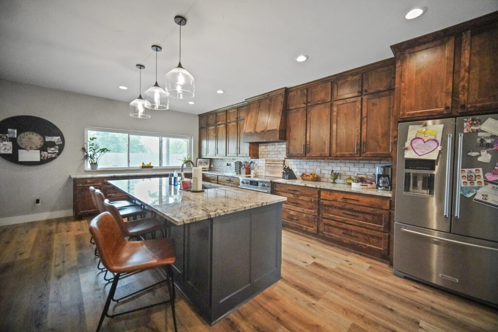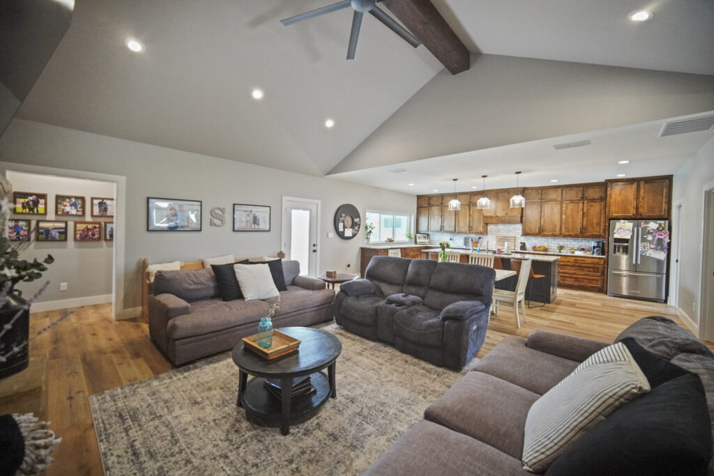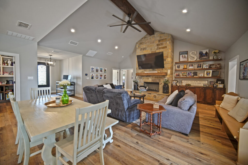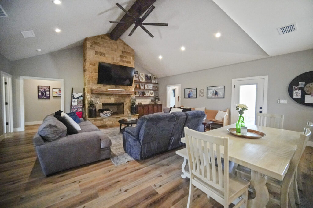 Step into the heart of the home and you’re immediately greeted by a stunning den with a soaring 14-foot cathedral ceiling, accented by a striking wood beam that runs the full length of the room. Luxury plank flooring flows throughout, complementing the warmth of the rocked fireplace—plumbed for propane or adaptable for electric use—creating a cozy yet refined gathering space.